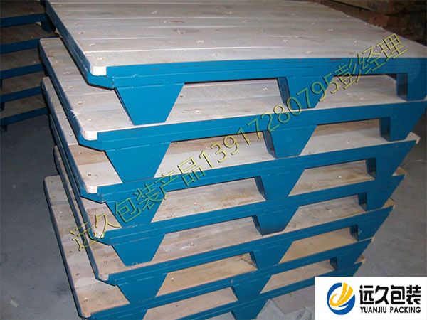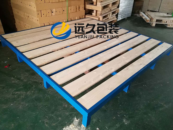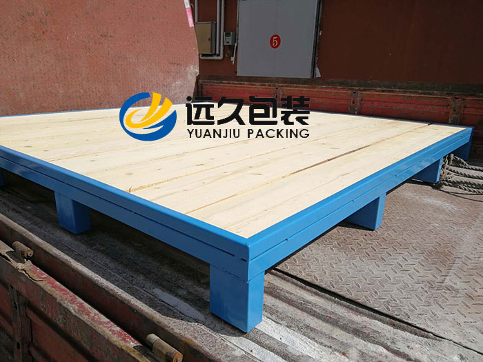 目前市场上使用的托盘从材料上看主要有木质托盘、塑料托盘、金属托盘、纸托盘、复合材料托盘。其中金属托盘承载能力在托盘中是非常强的,金属托盘的出现解决了重量大的物体运输中的安全问题。但是金属托盘成本费用有非常高,而且自重比较大是金属托盘一个无法改变的缺点。 钢结构托盘一般只是为了解决较重货物的承载问题才选用,如果对托盘强度要求非常高,而且又要一定程度上控制托盘的自重和成本,就需要通过改善结构设计来克服金属托盘自重大、成本高这一缺点。在这种市场需求客户需要的情形下,我司研发了一款金属钢制框架重型木托盘金彩汇,很好的解决了既可以控制成本,又有高强度的托盘品种。 金彩汇此款托盘是我司在2011年根据客户需求,为客户量身设计定做的一款载重能力超大的木托盘,最大载重量可达8000kg,金属钢制框架重型木托盘现在在市面上流通使用极少,在当时更是没有。此款金属钢制框架重型木托盘使用的是四向进叉结构,九个大脚用的是矩形钢,中层加上加厚的钢质横梁,四周的防撞梁焊接30的角钢,顶层用30mm厚度的加宽木板满铺,按照这个思路,很好的平衡了木托盘静载重量与动载重量,设计之初,客户对我们的思路十分满意,木托盘使用后的事实证明,效果非常的好,达到了客户预期需求。 金属钢制框架重型木托盘既解决了单纯的木质结构木托盘底部载重达不到所需要求,又很好克服了金属喷塑钢制铁托盘面板载重稍弱的情况,此款金属钢制框架重型木托盘的设计也为超重型托盘的设计提供了一个方向,可谓是开了一个金属钢制框架重型木托盘的先例。如果按它的材质归类,既可以归类为木托盘,也可以归类为铁托盘,结构是四向进叉结构,所以我司将其命名为金属钢制框架重型木托盘。